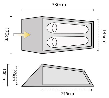 Pour une installation facile et sécurisée, la tente est équipée d’œillets et de boucles pour la fixation des mâts, ainsi que d’un cordon de suspension interne pratique pour faire sécher les vêtements ou ranger le matériel. Avec un poids total de 2720 grammes et des dimensions extérieures de 330 x 170 x 100 cm, elle reste suffisamment légère et compacte pour être transportée aisément grâce à son sac de rangement robuste.