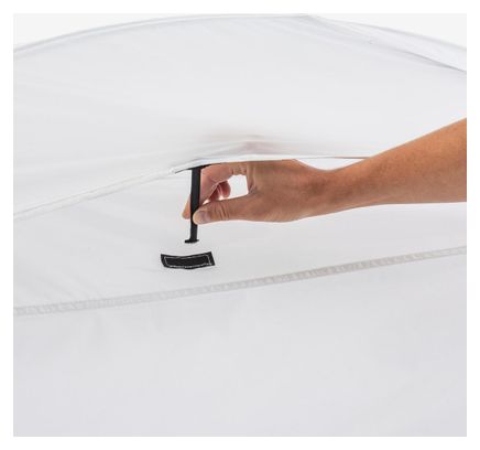 Pour monter la tente, il suffit de déployer l’arceau en aluminium léger et résistant, qui se divise en quatre pieds pour assurer l’auto-portance de la structure. Il est essentiel de bien tendre la tente et de déployer tous les haubans pour garantir sa résistance au vent, validée jusqu’à 70 km/h.