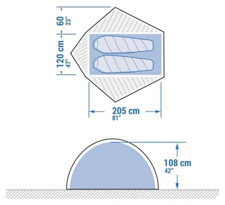 Matériaux | Chambre intérieure: 65% Polyamide, 35% Polyester Tissu principal: 20% Polyuréthane thermoplastique, 80% Polyester Arceau: 100% Aluminium Sardines: Aluminium 7075 T6 Double-toit: Polyester (PES) 20 deniers Tapis de sol: Polyamide (PA) 40D NC |