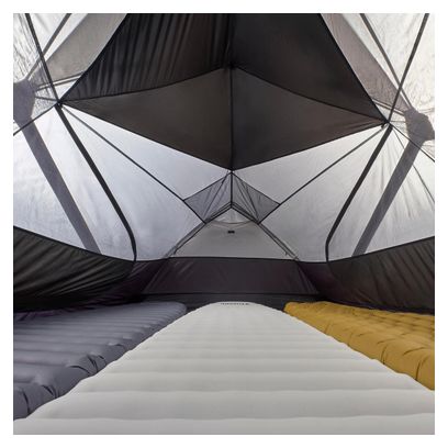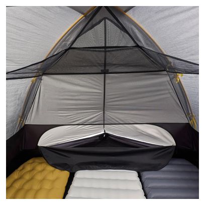 Cette tente est équipée de deux portes séparées et de trois absides, idéales pour ranger jusqu’à trois sacs à dos de 70 litres. Les six poches intégrées dans la chambre permettent d’organiser facilement vos affaires. Sa conception assure une résistance au vent jusqu’à 65 km/h, validée en soufflerie, et une imperméabilité remarquable avec un double-toit ayant une colonne d’eau supérieure à 2000 mm et un tapis de sol à 3000 mm.