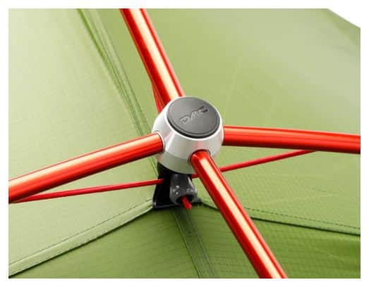 - - Liaison élastique entre la tente extérieure et l’armature pour compenser les rafales de vent