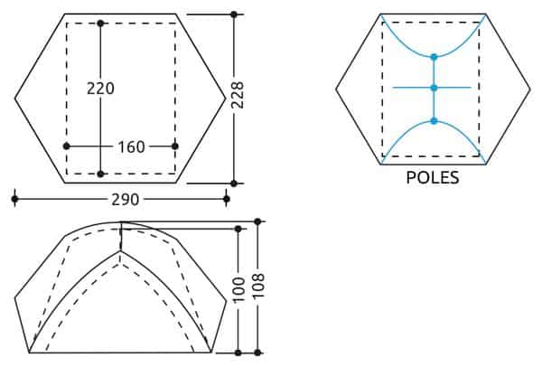 Pour les journées chaudes ou sans vent, les toiles à pourrir peuvent être repliées et fixées sur les parois, augmentant ainsi la fonctionnalité de la tente. Les deux entrées zippées et les grandes absides des deux côtés offrent un abri supplémentaire et un accès facilité, même en cas de mauvais temps. La stabilité de la tente est renforcée par un système de fixation au sol avec cordelette réglable, permettant un positionnement optimal des piquets en aluminium de 15 cm, légers et robustes.