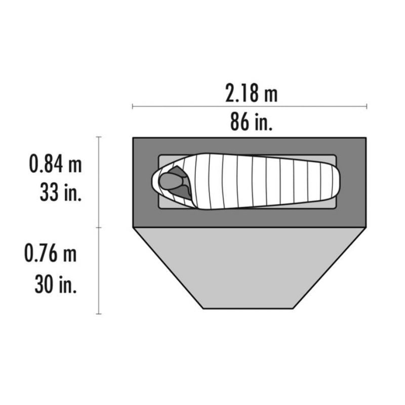Avec un poids minimum de 1,78 kg et un poids emballé de 2,16 kg, cette tente est facilement transportable. Ses dimensions de plancher de 218 x 76 cm et une surface au sol de 2,69 m² offrent un espace suffisant pour se reposer après une journée de randonnée. La hauteur intérieure de 100 cm permet de se mouvoir aisément à l’intérieur.