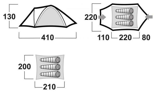 Les dimensions totales de la tente sont de 410 × 220 × 130 cm, ce qui lui confère une bonne hauteur pour se déplacer aisément à l’intérieur. Avec un poids de 5200 g, la Husky Bizon 3 Plus reste relativement légère pour une tente de cette taille, facilitant son transport lors de vos randonnées.