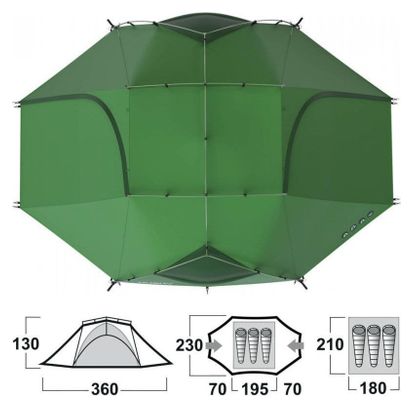 L’architecture de la tente assure une excellente sensation d’espace, tout en garantissant une haute imperméabilité pour vous protéger des intempéries. Les deux entrées et les deux absides permettent de ranger facilement vos bagages et d’accéder à vos affaires sans déranger vos compagnons de trek. Avec un poids de 4500 g, elle reste relativement légère pour une tente de cette taille, et son volume plié de 52 x 17 cm la rend facile à transporter.