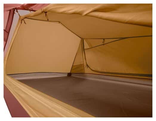 La tente se distingue par ses grandes entrées latérales qui facilitent l’accès et le rangement. Son montage rapide est un atout majeur, permettant de la déployer facilement même dans des conditions météorologiques difficiles. Grâce à ses deux vestibules et ses deux ouvertures de ventilation dans le toit, elle assure une bonne circulation de l’air, tout en protégeant contre les intempéries. La valve de ventilation située derrière la porte intérieure, dotée d’empiècements en mesh anti-moustique, garantit une aération optimale sans intrusion d’insectes.