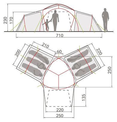 Cette tente se distingue par ses deux cabines-chambres, permettant une séparation des espaces pour plus d’intimité. La ventilation est optimisée grâce au système Top-Vent de VAUDE et aux fenêtres de ventilation supplémentaires, garantissant une circulation d’air agréable même lors des journées chaudes. L’abside intérieure spacieuse offre un espace supplémentaire pour le rangement ou pour se protéger des intempéries.